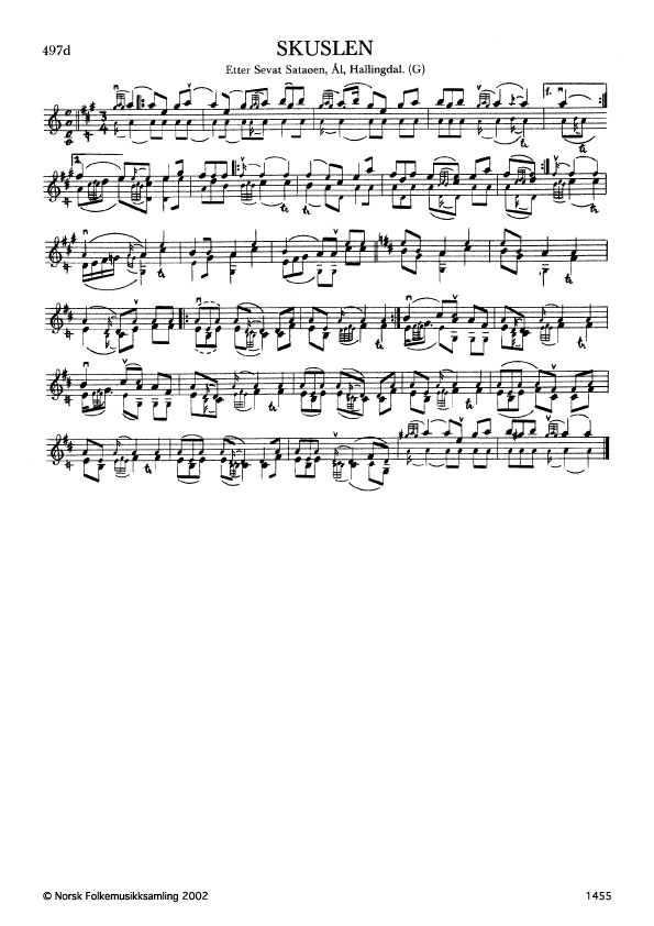 Skuslen. Etter Sevat Sataøen, Ål, Hallingdal. G. 1418, 1962. NRK magn. 1875. Sataøen hadde slåtten etter Myreguten, Ola J. Myro, Ål. I byrjinga av 2. takt nyttar ein posisjonsgrepet ciss på kvintstrengen. Då seier ein at ein skuslar handa oppover felehalsen. (Magne Myhren).