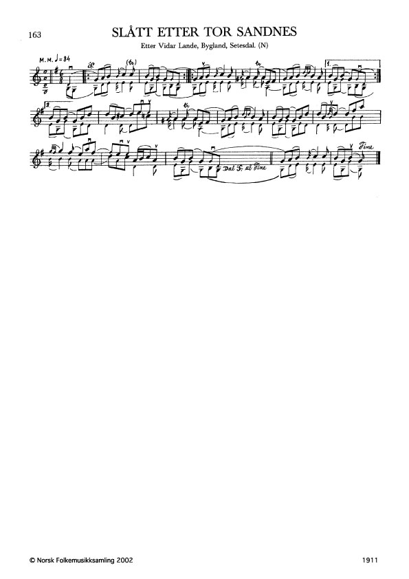 Slått etter Tor Sandnes. Etter Vidar Lande, Bygland, Setesdal. N. 1978. Td. 1861. Slåtten har Frøyrak-form og er ein variant av Gjerki Haukeland (band 1 nr. 111 og band 7 nr. 122). I Evje kallast han Evjemusen.
