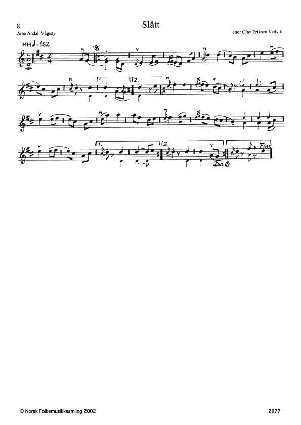Vedvik lærte den helst av faren Erik eller Wilhelm Barmen. Andal er i tvil om slåttetypen: “.. kanskje ein variant av gamalt”. Slåtten har fellestrekk med annet gamaltmateriale, men har også vendinger som med minimale justeringer likner reinlender (jf G7).