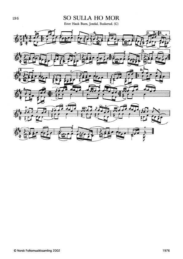 So sulla ho mor. Etter Hauk Buen, Jondal, Buskerud. G. 1936, 1972. NRK magn. 54621. Buen lærte slåtten av Tarjei Skinan, soneson av Myllarguten (sjå nr. 195). Jfr. band 3 nr. 155.