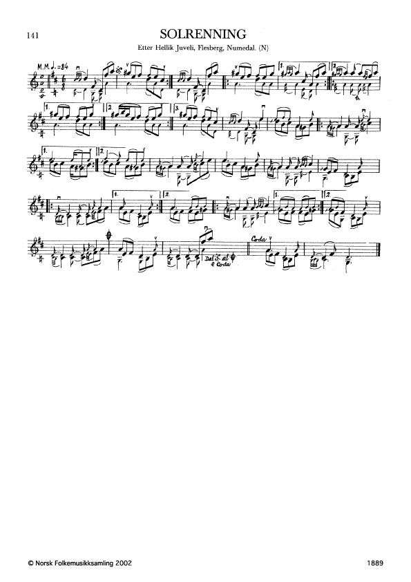 Solrenning. Etter Hellik Juveli, Flesberg, Numedal. N. 1978. Td. 1875. Anders Ødegaarden lærte fleire slåttar av Ola Naper i Amerika og Juveli har slåtten etter Ødegaarden (Øygarden). Håvard Gibøen skal og ha spela denne slåtten. Jfr. band 1 nr. 56.