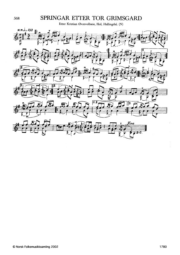 Springar etter Tor Grimsgard. Etter Kristian Øvrevollseie, Hol, Hallingdal. N. 1978. Td. 1842. Spelemannen gjør her stendige småendringar i detaljar under framføringa.