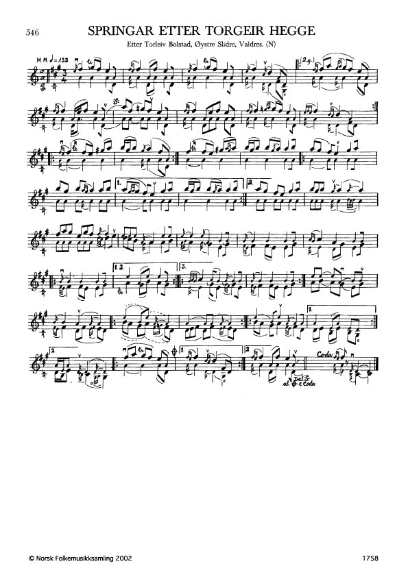 Springar etter Torgeir Hegge. Etter Torleiv Bolstad, Øystre Slidre, Valdres. N. 1977. Td. 1691. Første del av denne slåtten er mykje lik første del av Sylkjegulen, band 5 nr. 400b. Andre variantar: G. 1836, etter T. Bolstad.