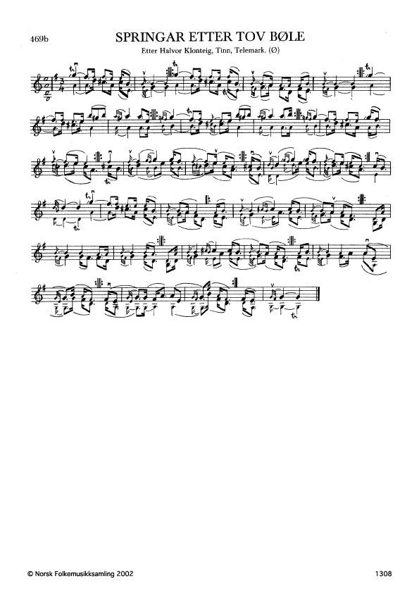Springar etter Tov Bøle. Etter Halvor Klonteig, Tinn, Telemark. Ø. 521, 1957. Klonteig lærde slåtten av spelemannen Tov Bøle, Tinn.