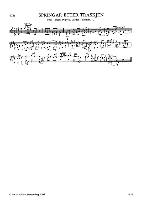 Springar etter Traskjen. Etter Targjei Tvigyva, Lårdal, Telemark. G. 698, 1921. Det var spelemannen Olav Naper, Fyresdal, Telemark, dei kalla Traskjen. Jfr. Hans Ross, Norsk Ordbog, en Trask: liden, svag, sløv og forsagt Stymper; å traska: gå omkring som en "Trask".
