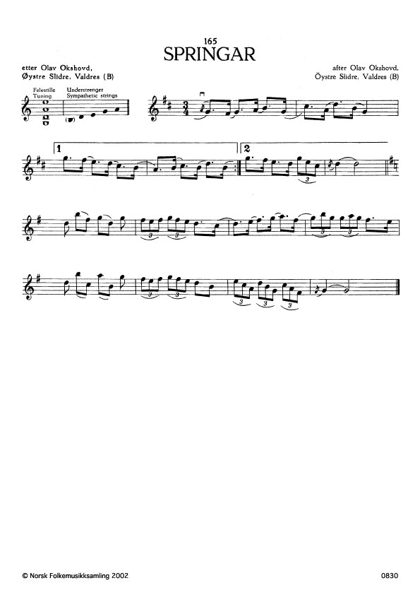 (Springar) B. 1292. Oppskr. kring 1930. Okshovd hadde lært slåtten av Ola Vedhamar, Øystre Slidre, Valdres, som døydde 70 år gamal, i 1900.