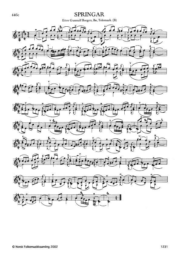 Springar. Etter Gunnulf Borgen, Bø, Telemark. B. 1098, 1947. Borgen lærde slåtten av far sin, Halvor Borgen, som atter hadde han frå Lars Fykerud, Sauherad.