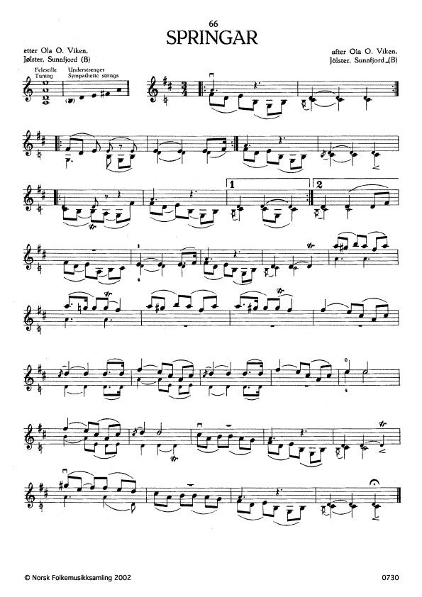 (Springar) B. 217. Oppskr. 1930. Viken hadde lært slåtten av Hans Skei, Jølster, Sunnfjord og denne atter av Anders Lægro, Helgheim, Jølster. Lægro spela mykje på fleire stille.