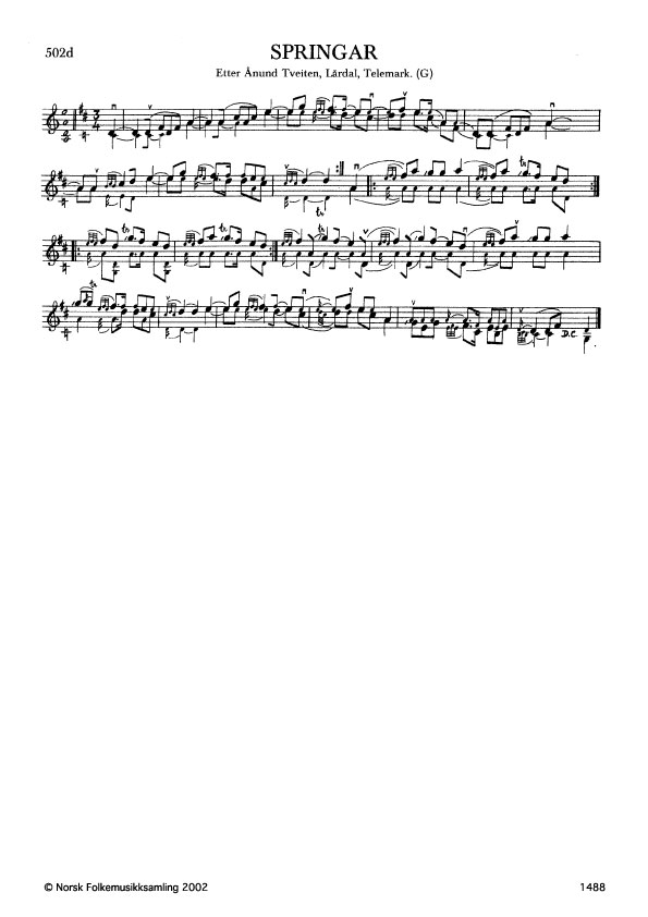 Springar. Etter Ånund Tveiten, Lårdal, Telemark. G. 410, 1944. Groven lærde slåtten i 1909, og skreiv han opp etter minne.