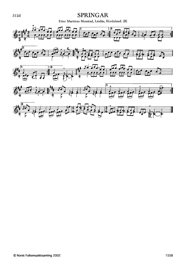 Springar. Etter Martinus Monstad, Lindås, Hordaland. B. 419, 1918. Monstad hadde lært slåtten av Helge S. Stortveit, Fana, i 1870-åra. Denne hadde han frå ein gamal spelemann som heitte Mons Milde. Han var frå Voss, men var busett på Milde i Fana. Dei kalla han og Mons i Åsen.