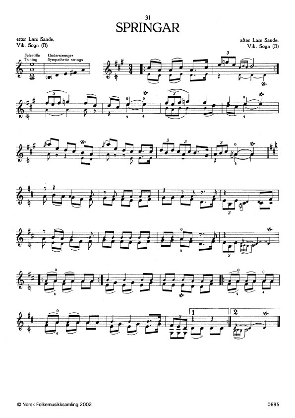 (Springar) B. 616. Oppskr. 1916. Sande hadde lært slåtten av Anders Dyrdal, Kyrkjebø, i 1890-åra. Byrjinga kjem litt inn på Skinnarlanden.