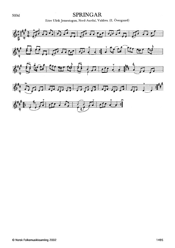 Springar. Etter Ulrik Jensestogun, Nord-Aurdal, Valdres. Einar Övergaard 1892-93. Övergaard var ein svensk musikkforskar som i 1890-åra m.a. budde i Valdres fleire sumrar. Det er frå Övergaard si manuskriptsamling i Uppsala Landsmålsarkiv denne oppskrifta er henta.