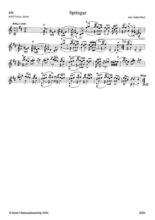 Melodigangen i hovedsak lik a. Men Paulen har påfallende bruk av lange bogestrøk og medklingende strenger, kanskje påvirkning fra Maurset-stilen slår gjennom (se a, e).