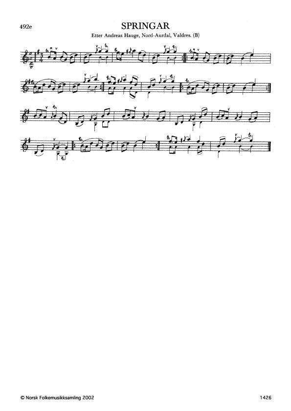 Springar. Etter Andreas Hauge, Nord-Aurdal, Valdres. B. 320, 1925. Hauge lærde slåtten av Ulrik Jensestogun, som atter hadde han frå Bendik i Nøen, begge Nord-Aurdal.