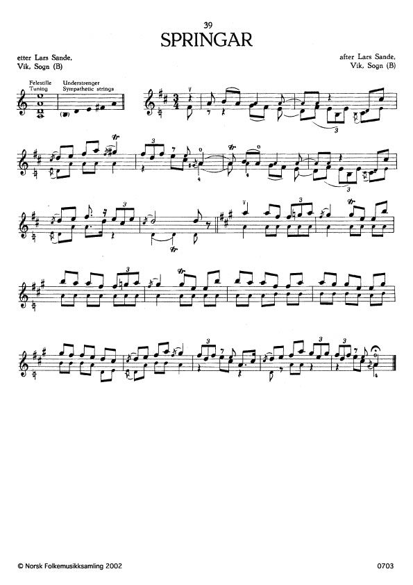 (Springar) B. 642. Oppskr. 1917. Sande hadde lært slåtten av Ola Osland, Lavik, Sogn, som venteleg hadde han fra Jens Fresvik (Skrangle-Jens), Leikanger, Sogn.