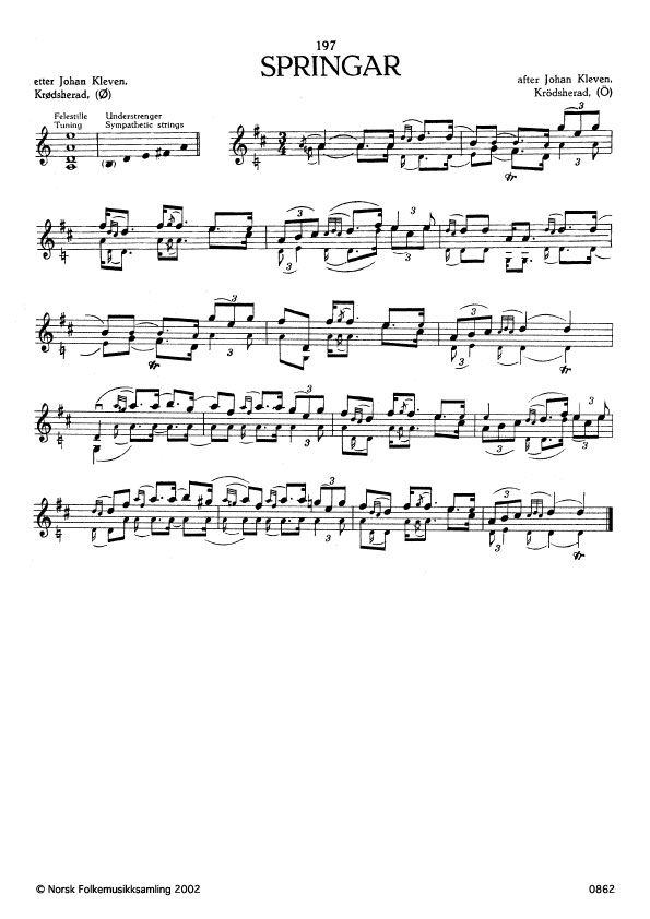 (Springar) Ø. 74. Oppskr. 1929. Kleven hadde slåtten etter far sin, Ola Helgesen Kleiva (Gammelkleven). Siste taket i denne slåtten (takt 13-14) er svært likt fyrste taket i "Springdans fra Bergen", Lindeman, N. Fj., nr. 96.