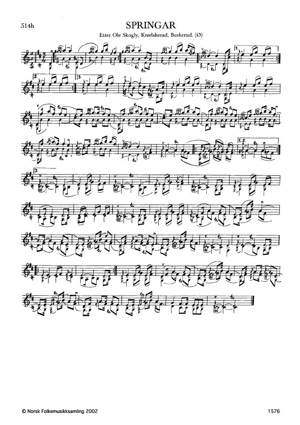 Springar. Etter Ole Skogly, Krødsherad, Buskerud. Ø. 57, 1931. Skogly lærde slåtten av Hans Hagen, Krødsherad. Andre variantar: Ø. 175 etter O. Evju, Ø. 258 etter O. Heggland, G. 548, Kari Kantebakken, etter S. Groven.