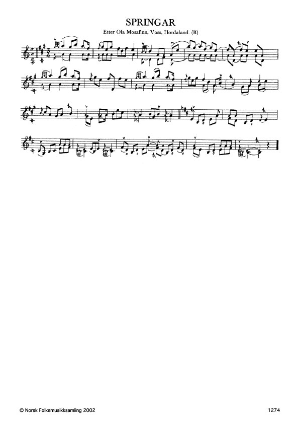 Springar. Etter Ola Mosafinn, Voss, Hordaland. B. 113, 1908. Mosafinn lærde slåtten av Johannes Fossmark, Bruvik, i 1850.