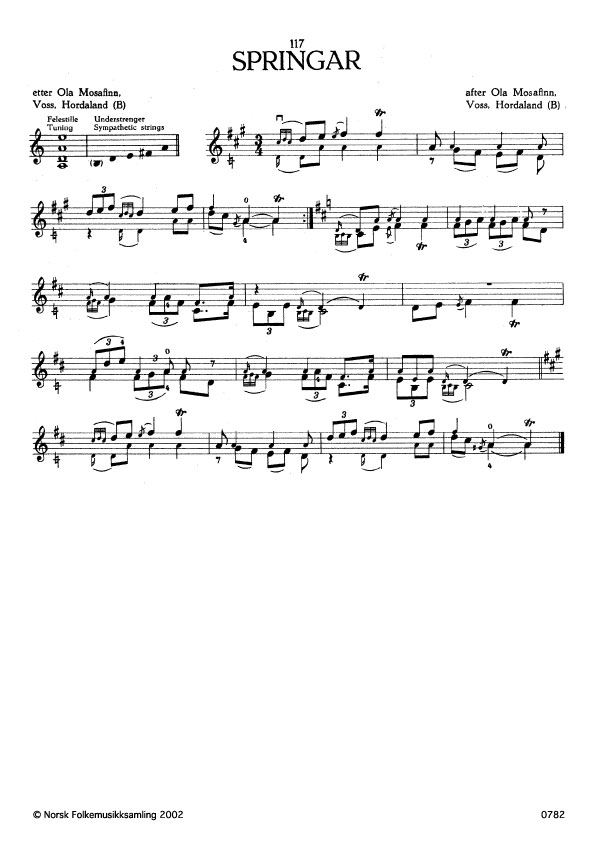 (Springar) B. 23. Oppskr. 1908. Mosafinn hadde lært slåtten i 1835 av Anders Borge, Voss, Hordaland.