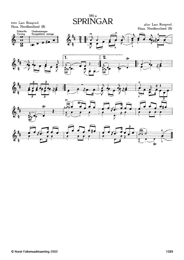 (Springar) B. 12. Oppskr. 1915. Rongved lærde slåtten av Magne Kleiveland (Einlidskarden), Haus, Hordaland, og denne hadde han etter Nils Rekve, Voss, Hordaland.