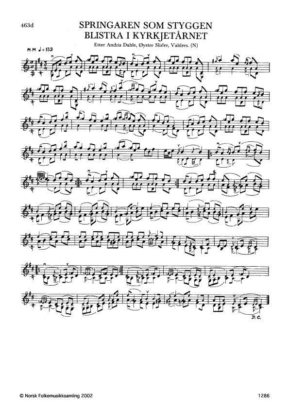 Springaren som Styggen blistra i kyrkjetårnet. Etter Andris Dahle, Øystre Slidre, Valdres. N. 1975. Td. 1521. Jfr. G. 1114. Dahle lærde slåtten av bestefar sin, Ivar Ringestad, Vestre Slidre.