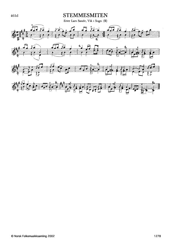 Stemmesmiten. Etter Lars Sande, Vik i Sogn. B. 669, 1916. Slåttenamnet kjem av ein stein som ligg i føra i nærleiken av Sande i Kyrkjebø, Sogn. Ein gong Lars Sande spela denne slåtten i ein robåt, støytte dei mot Stemmesmiten.