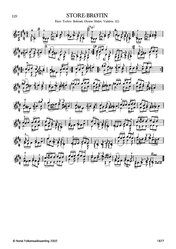 Store-Brøtin. Etter Torleiv Bolstad, Øystre Slidre, Valdres. G. 1505, 1964. NRK magn. 1688. Bolstad lærte slåtten av Ola Okshovd, som hadde laga siste veket. Jfr. band 1 nr. 91 og dette bandet nr. 137.