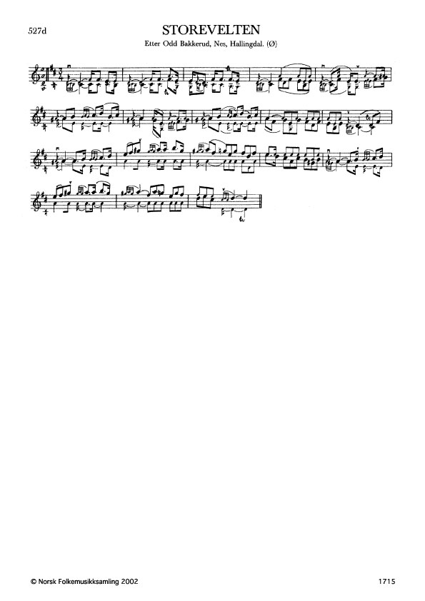 Storevelten. Etter Odd Bakkerud, Nes, Hallingdal. Ø. 409. Bakkerud hadde slåtten etter sin morbror, Knut Bakkerud, og han igjen etter Tor Grimsgard, begge Nes. Storevelt: Ein uvanleg god slått, ein trumf.