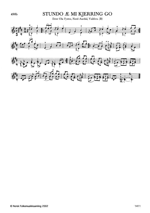 Stundo æ mi kjerring go. Etter Ola Fystro, NordAurdal, Valdres. B. 933, 1934. Fystro hadde slåtten frå Ulrik Jensestogun, og han att frå Bendik i Nøen, begge Nord-Aurdal .