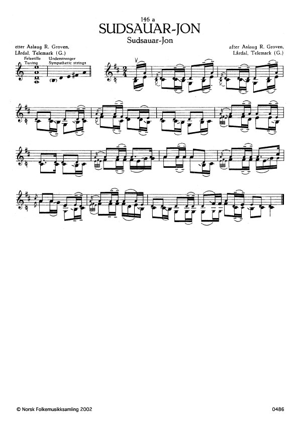 (Sudsauar-Jon) G. 639. Oppskr. 1920. Aslaug Groven var syster til Olav R. Berge, Rauland, og mor til komponisten Eivind Groven. Slåttenamnet etter garden Sud-Saunar i Heddal. Slåtten vart tralla eller sungen med denne teksta: Sudsanar-Jon kom tilbakars og sjå til dotter di då. Fyrst var ho så, og sidan blei ho så.
