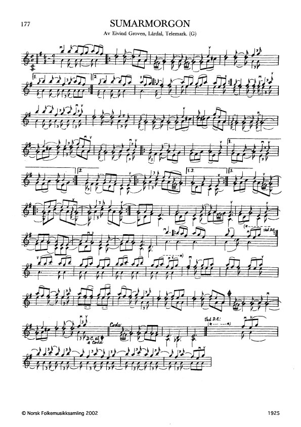 Sumarmorgon. Av og etter Eivind Groven, Lårdal, Telemark. G. 1861. NRK magn. 52964. Groven laga slåtten i 1953. "…I slåttane Brønnslåtten (nr. 636) og særleg i Sumarmorgon har eg … laga eit felestille som krev at ein spelar i d-moll, men det blir svært mange fine avskugningar på grunn av felestillet, avskugningar og kombinasjonar som ikkje er kjende før i hardingfeleslåttane." Groven i intervju med Y. Daliot 1969-1971.