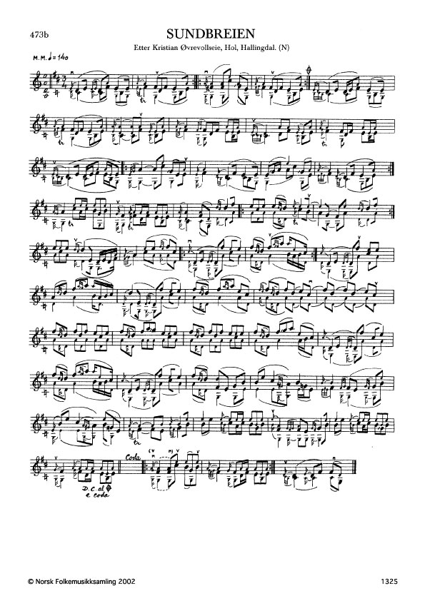 Sundbreien. Etter Kristian Øvrevollseie, Hol, Hallingdal. N. 1975. Td. 1443. Øvrevollseie lærde slåtten av spelemannen Eivind Hollebakken, Ål.