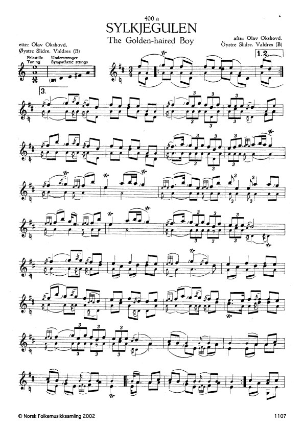 (Sylkjegulen) G. 874. Oppskr. 1952 etter opptak i NRK. Sylkjegulen = den silkegule; ein med silkegult har. Det skal vera Bendik Toreson (Bendik i Nøen) som har laga slåtten. Sjå Spelmannsbladet 1956 nr. 7-8, s. 25 og 1959 nr. 5-6 s. 13.