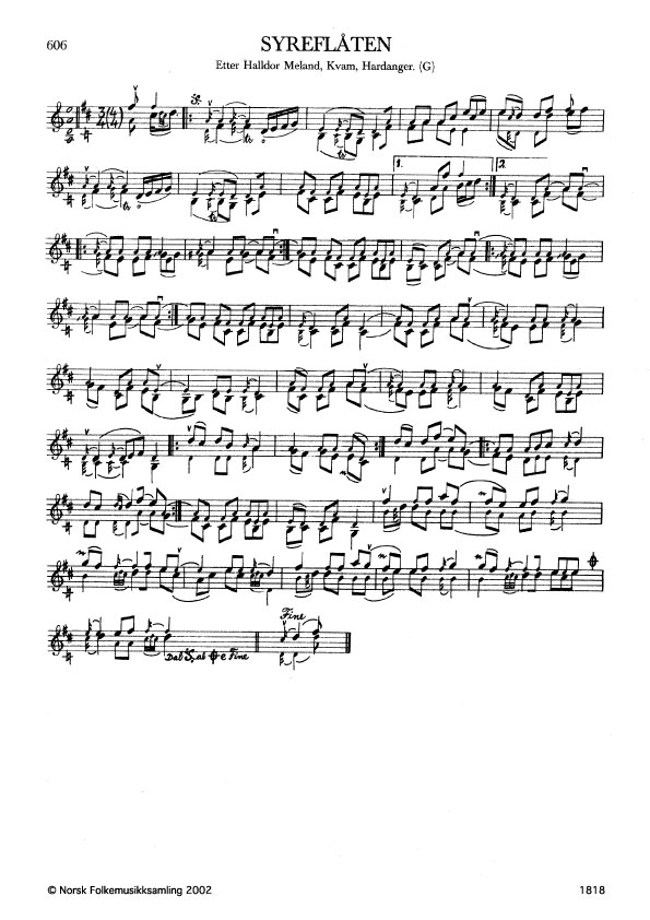 Syreflåten. Etter Halldor Meland, Kvam, Hardanger. G. 1539, 1964. Meland lærte slåtten av Sjur Syreflåt, Hardanger. Jfr. band 5 nr. 392.