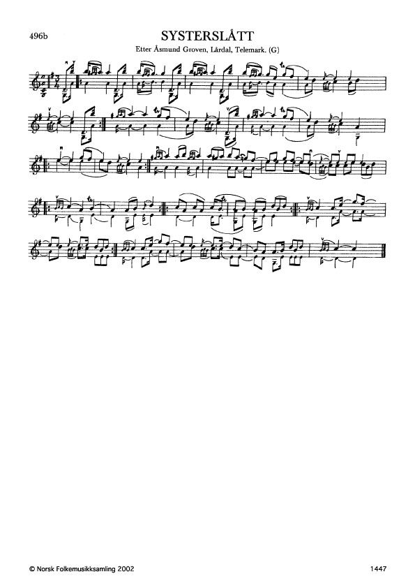 Systerslått. Etter Åsmund Groven, Lårdal, Telemark. G. 443, 1944. Jfr. Ø. 531. Åsmund Groven hadde lært slåtten av Hans Smeland, Seljord. Systerslåtten er truleg ein av Kivlemøyslåttane. Jfr. 480b.