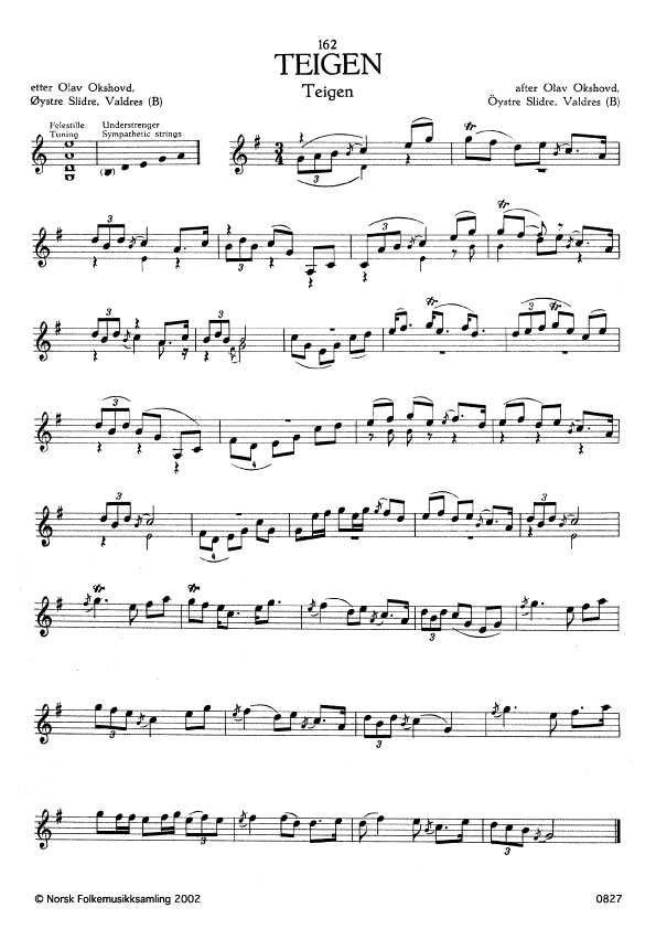 (Teigen) B. 1115. Oppskr. 1934. Okshovd hadde slåtten etter Anders på Teigen, Øystre Slidre, Valdres, som slåtten er oppkalla etter.