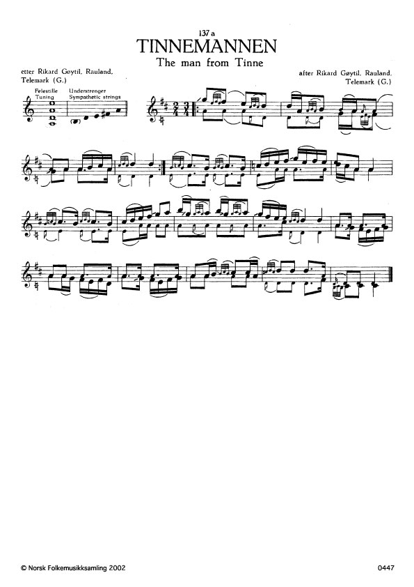 (Tinnemannen) G. 808. Oppskr. 1954 Gøytil hadde slåtten frå Olav R. Berge, Rauland, som truleg atter hadde han frå far sin, Rikard Berge (1815-1902). Tinnemannen heitte Olav Olson Tinne, Heddal. Han var ein kjend bondehovding som det går mange fråsegner om. Sjå: Svale Solheim. Slåttesegner. Manus. Norsk Folkeminnesarnling, U.B. Ei anna segn har: K. Løndal. Segna om "Tinnemann', i Spelmannsbladet 1952 nr. 1, s. 4, der og slåtten er trykt. Løridal meiner at Tinnemannen eigenleg var Ole Hovdejord, Heddal. Johs. Tveitan. Segna om Tinnemannen. Ibid. nr. 3, s. 15. Tveitan meiner at det rette er fortelnaden om Olav Tinne, som var ein historisk person (1680- 1765). Jfr. B.s. Ymis tradisjon s. 196. Ibid. Spelmenn. Telemark s. 116 og Holta Hitterdals historie. Slåtten som visstnok i gamal tid heitte Sirdalen, er innspela på grammofon (W. Farre. Pathefon 883).
