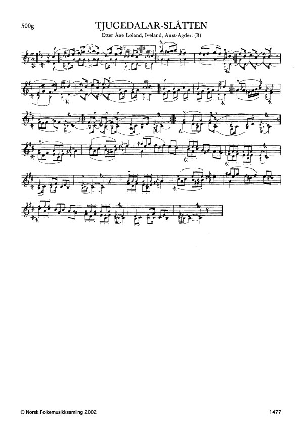 Tjugedalar-slåtten. Etter Åge Løland, Iveland, Aust-Agder. B.N.SI. 27. Løland hadde slåtten etter Halvor Flatland, Bø, Telemark. Andre vanantar: G. 842 etter Olav Midtgarden, jfr. G. 459; G. 1161 etter M. Manheim, jfr. Nordbø 46.