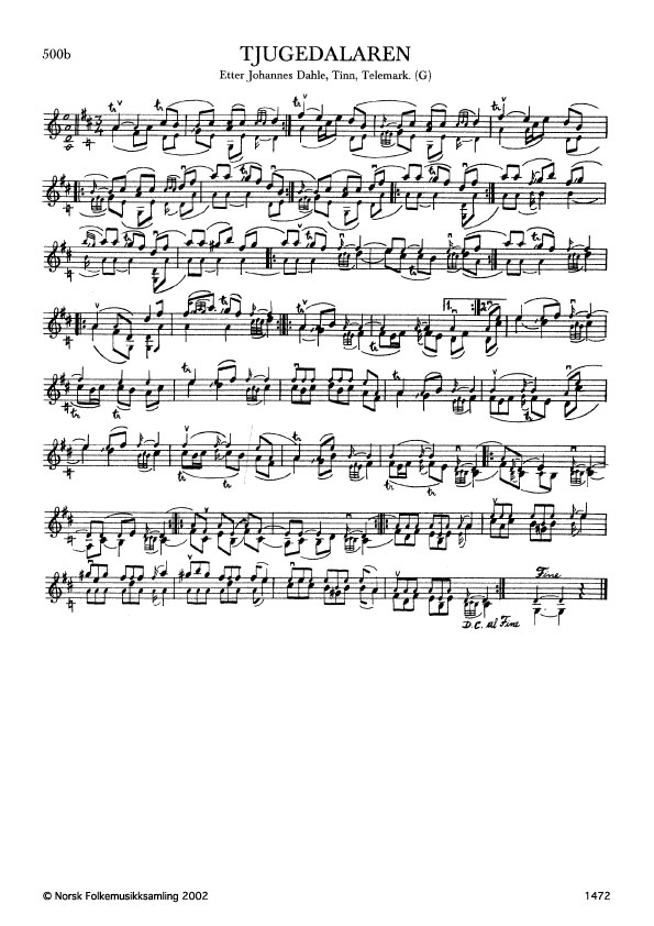 Tjugedalaren. Etter Johannes Dahle, Tinn, Telemark. G. 1310, 1961. NRK magn. 52986. Det er fortalt om Myllarguten at han ein gong var på ein gard i Bø. Dit kom to framandkarar som bad Myllarguten spela. Det ville han ikkje. Men dei to hadde høyrt at fekk dei berre Myllarguten til å spela ein slått, så ville han kome til å spela mange. Dei la då 20 dalar på bordet og bad han spela. Han tok fela og spela denne slåtten, tok pengane og la fela bort. Seinare gjekk Myllarguten til ein annan gard og spela der heile natta for inkje. Slåtten vart etter dette kalla Tjugedalaren. R. Berges "Myllarguten", s. 110.
