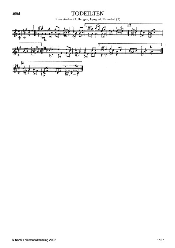 Todeilten. Etter Andres O. Haugan, Lyngdal, Numedal. B. 101, 1937. Haugan lærde slåtten av far sin, Ola Haugan, og han truleg av Gudbrand Skjellerud, Nes, Hallingdal.