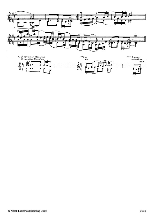 (Toleslåtten) B.N.S1. 4. Oppskr. 1908. Mosafinn hadde lært slåtten av Lars Tolo, Kvam, Hardanger. Seinare har slåtten ofte vorte kalla "Mosafinn". Dei nytta slåtten helst til rull, og dei kalla han og gjerne "Mosafinn- rudlen". Innspelingar av Ola Mosafinn, W. Farre Pathefon nr. 840. Av A. Bjørndal, Pathefon nr. 862.