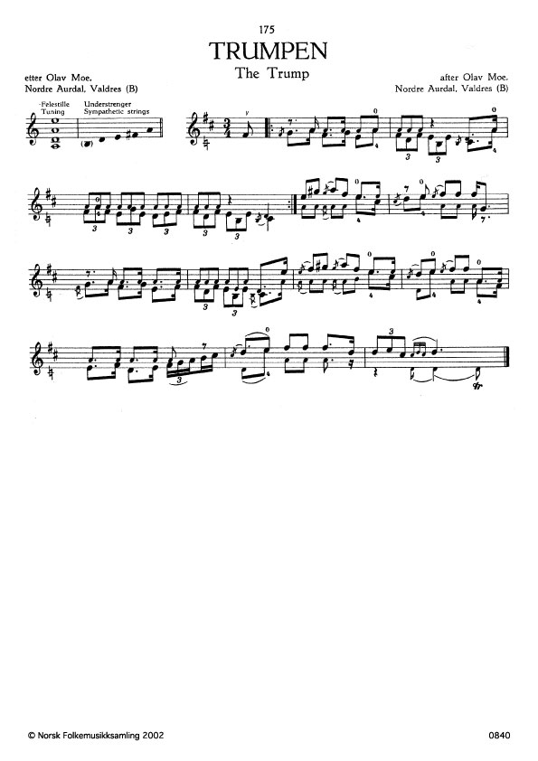 (Trumpen) B. 2192. Oppskr. 1947. Det er ein Hilme-slått, ei av Jørn-rengjene etter Jørn Hilme, Ulnes, Vestre Slidre, Valdres. Trumpen truleg = trumfen, ein som slo ut dei andre. Tomas Eltun, Øye, Vang, Valdres, hadde tilnamnet Trumpen, og slåtten skal ha fått namn etter han. B. s. Trad. Valdres, s. 72, 160.