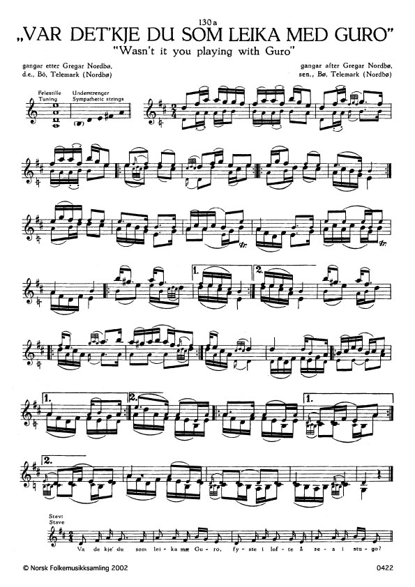 ("Var det'kje du som leika med Guro") Nordbø 89. Hos Nordbø står berre melodien, og E. Groven har så ført denne over til hardingfele att.