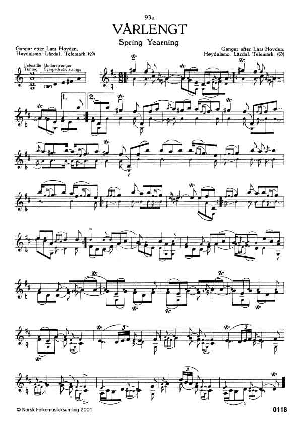 (Vårlengt) Ø. 125. Oppskr. 1918. Hovden lærde slåtten i Amerika av Lars Fykerud som hadde laga han. 93a-c er variantar. Slåttestevet sjå Cath. Elling - Norske Folkeviser VII s. 13. "Eg aktar inkje".