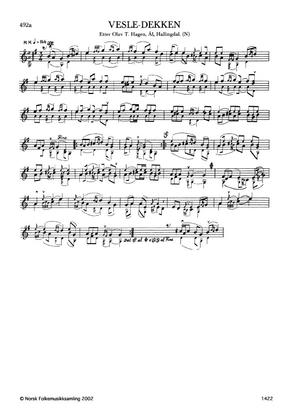 Vesle-Dekken. Etter Olav T. Hagen, Ål, Hallingdal. N. 1975. Td. 761. Jfr. Ø. 493b. Slåtten har namn etter spelemannen Ola Dekko d.y., Ål.