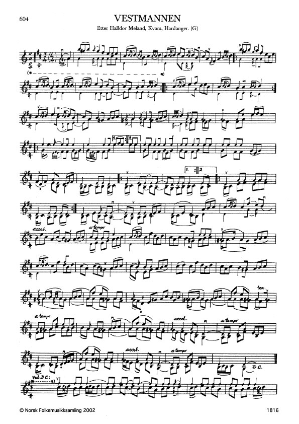 Vestmannen. Etter Halldor Meland, Kvam, Hardanger. G. 1945, 1964. Slåtten er etter Ola Mosafinn, Voss, og bygd ut av Halldor Meland. Sjå Jon Bleie: Halldor Meland, Oslo 1976, s. 49. Mosafinn si form står i band 4 nr. 111.