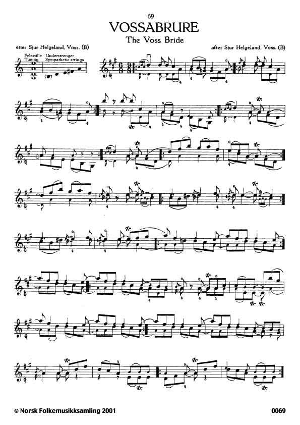 (Vossabruri) B.N.SI. 46. Oppskr. 1914. Slåtten er ein gamal brureslått frå Voss. Taket 12-14 i slåtten er det same som takt 7-11 i Hardinggjenta 70a og takt 17-23 i 70b.